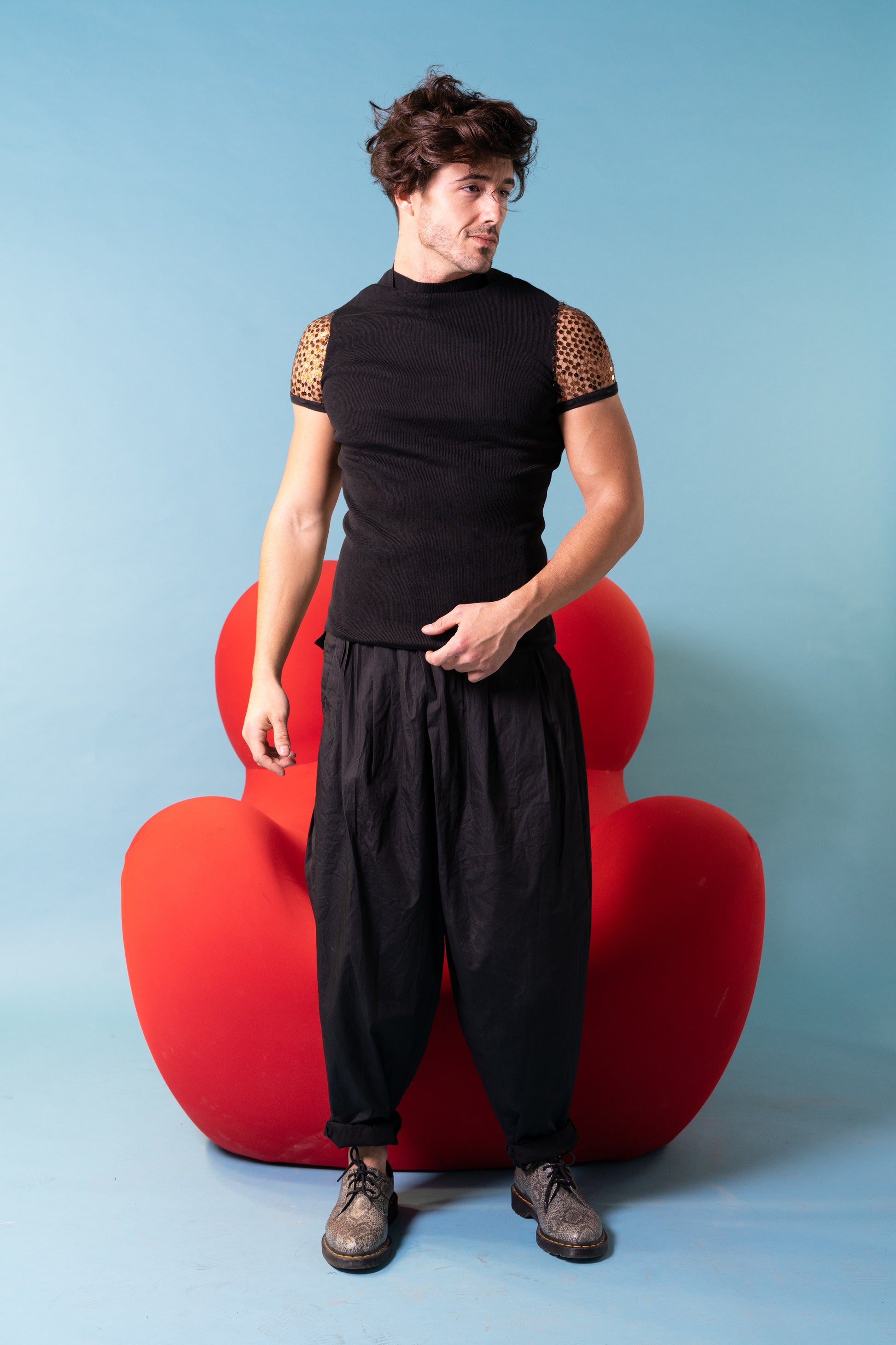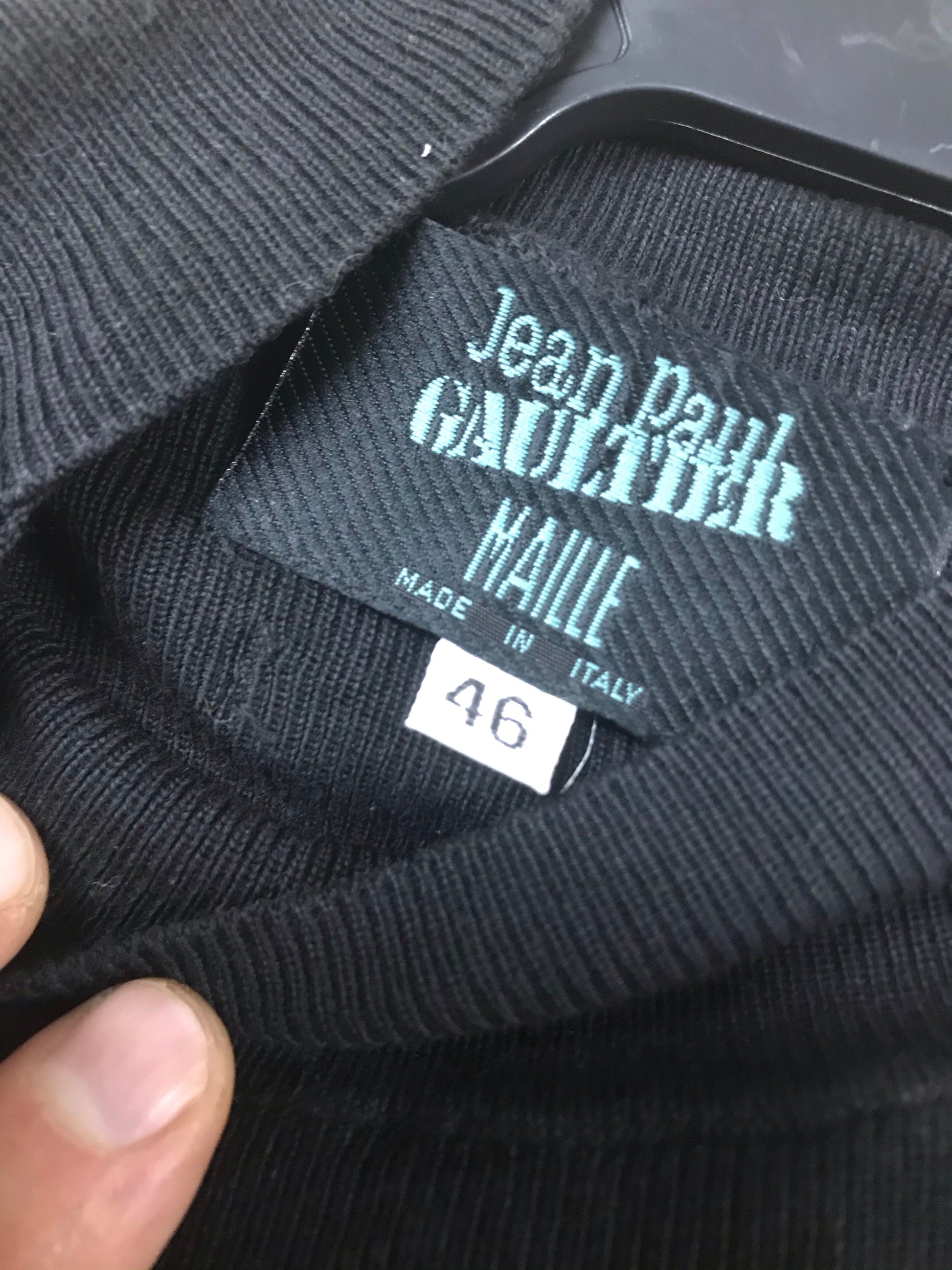 Vintage Jean Paul Gaultier maille homme T-shirtin rib cotton jersey with mesh sequins sleeves. Good condition. Slight signs of wear.