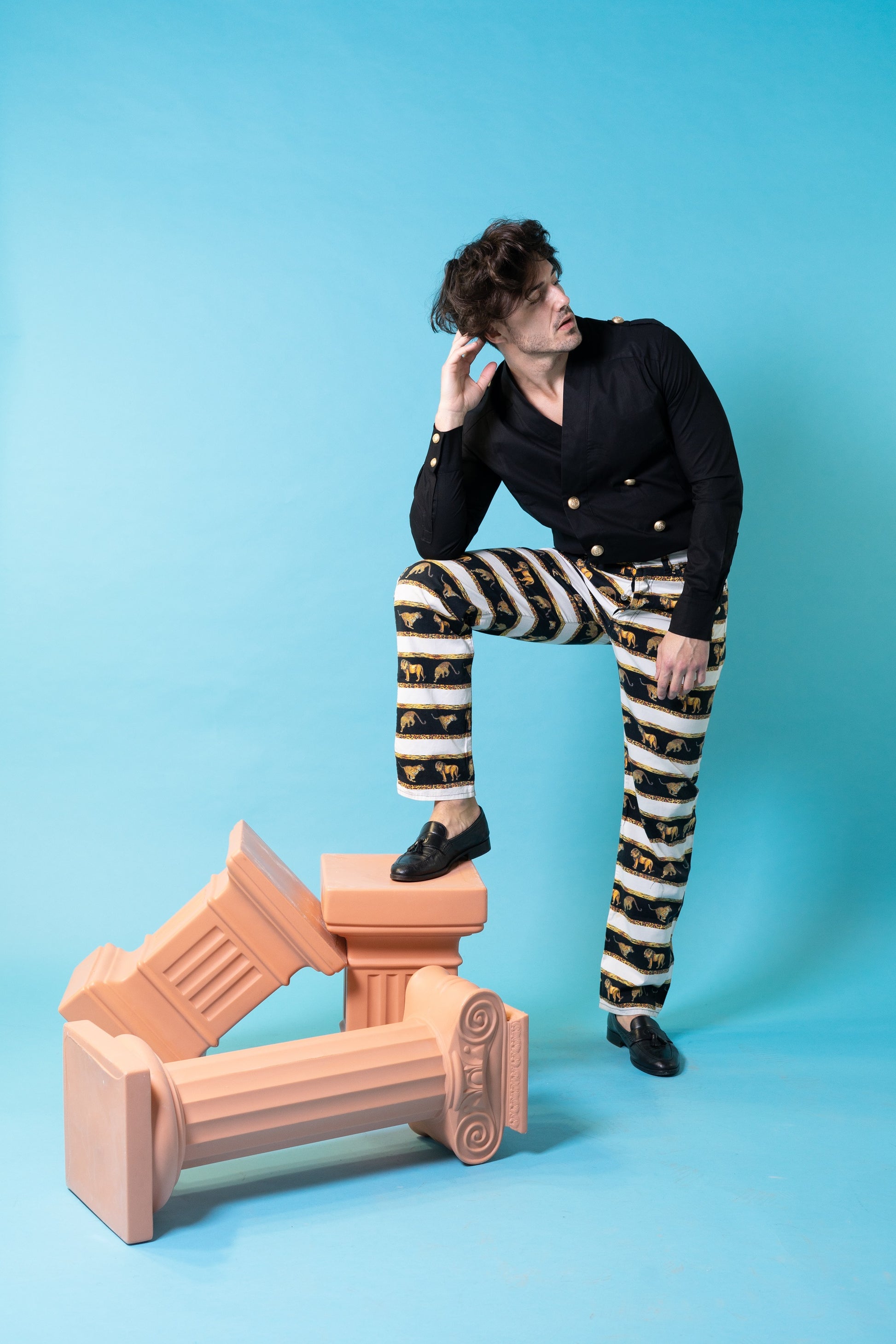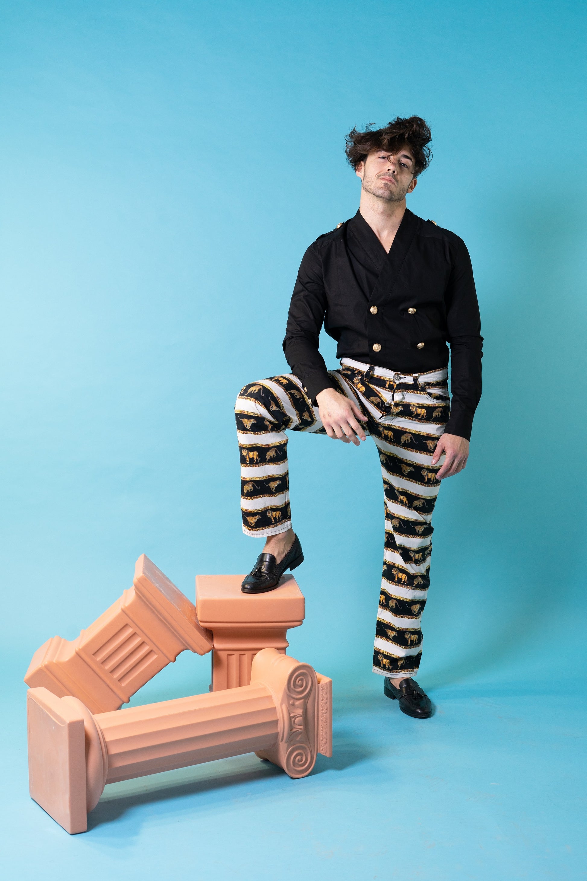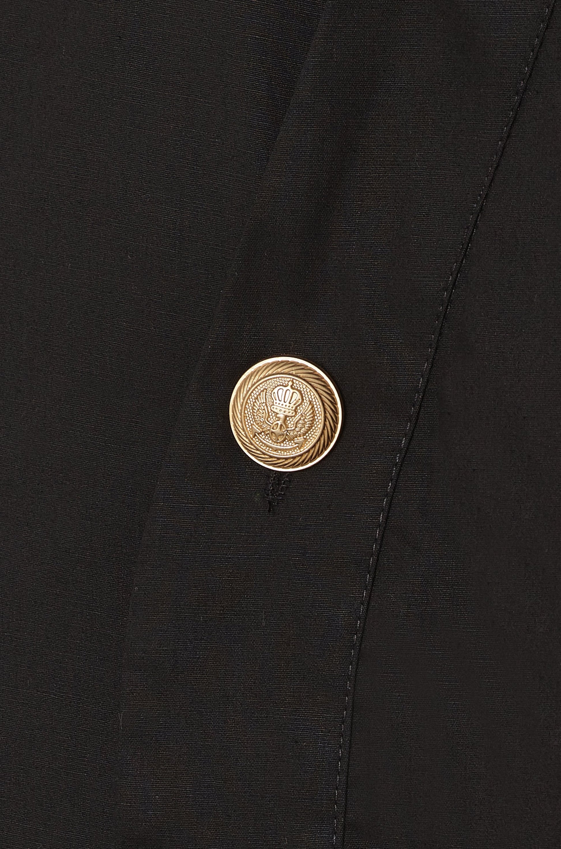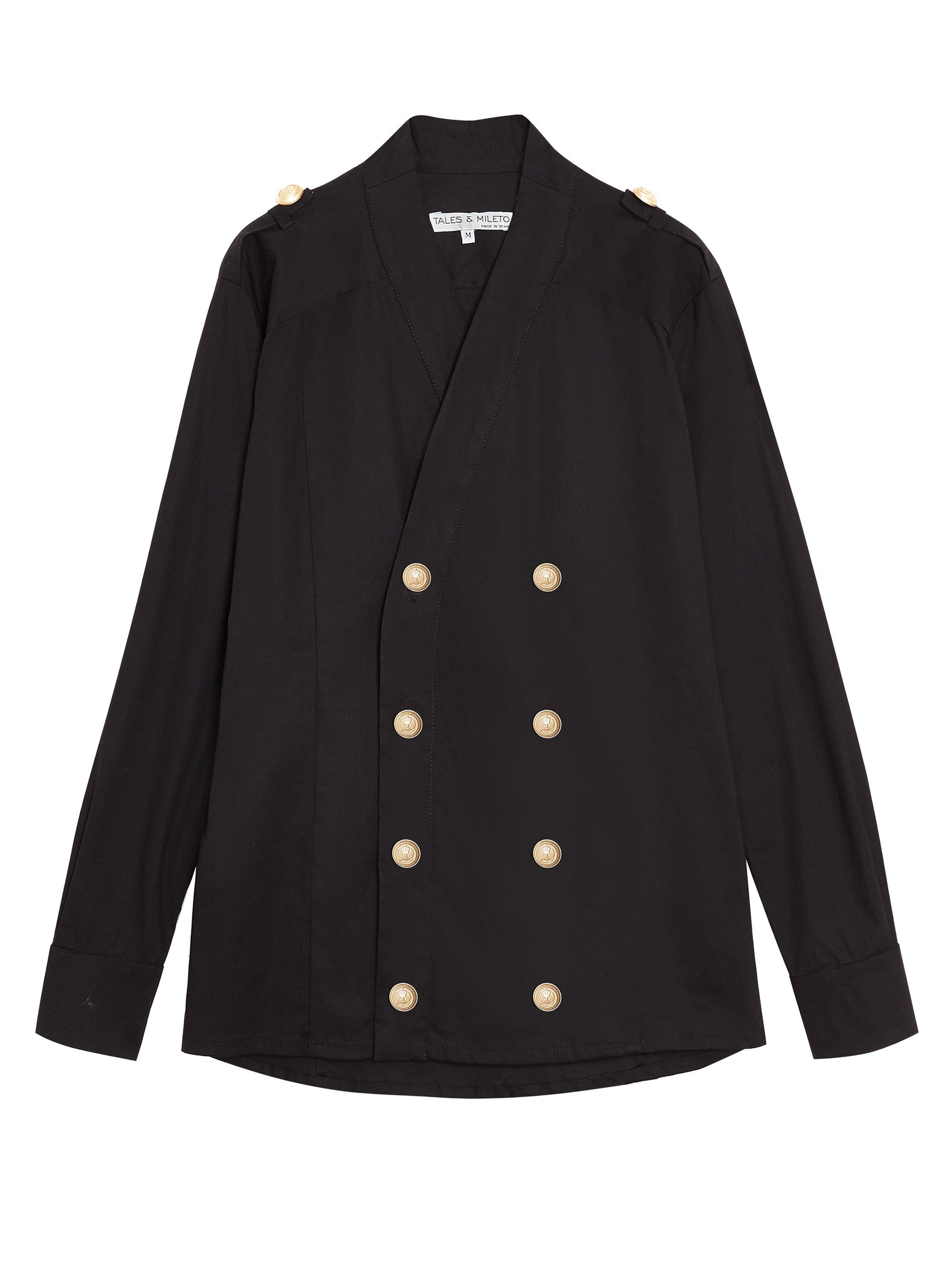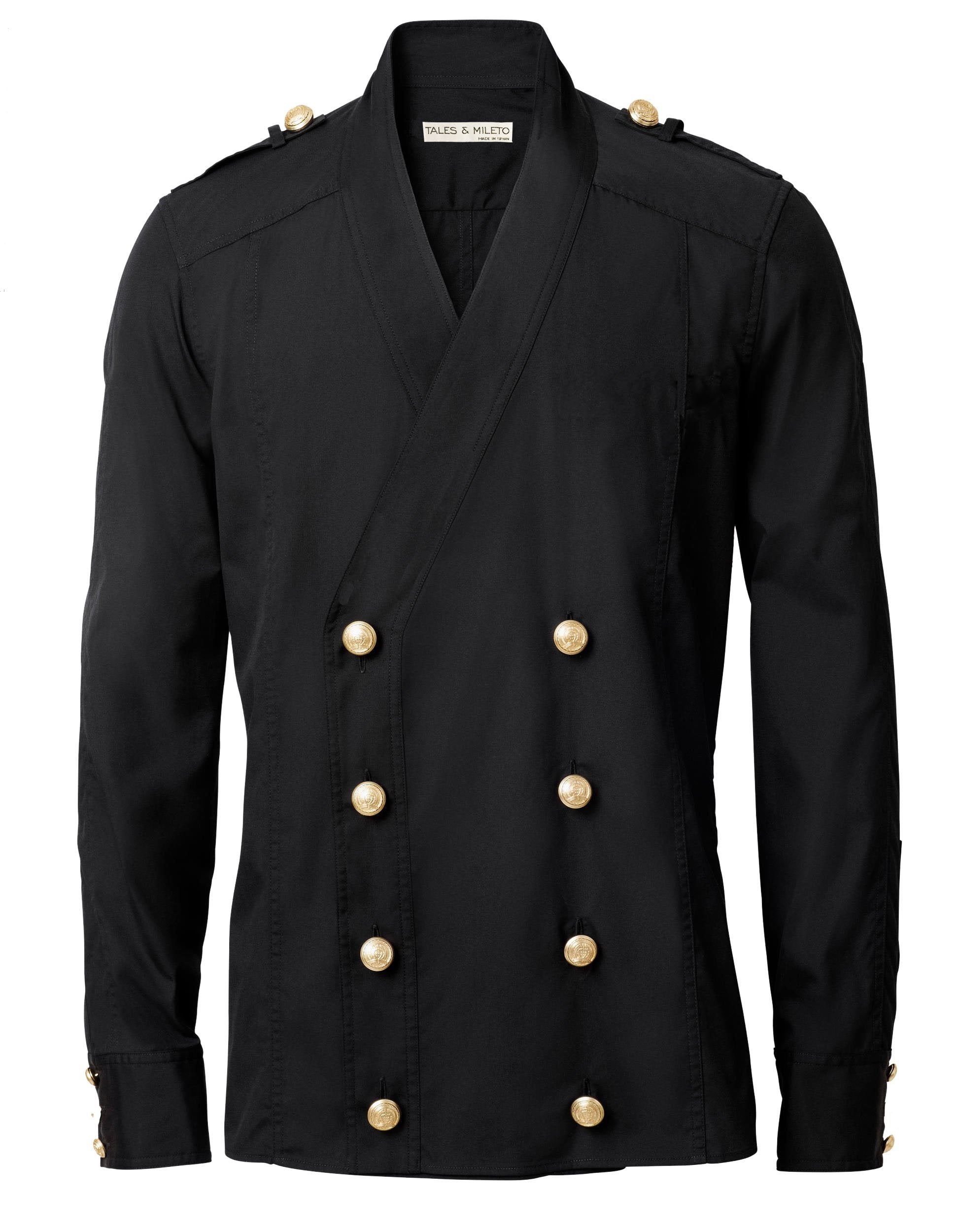 Long sleeve shirt. Double breasted. Kimono collar. Metal buttons.