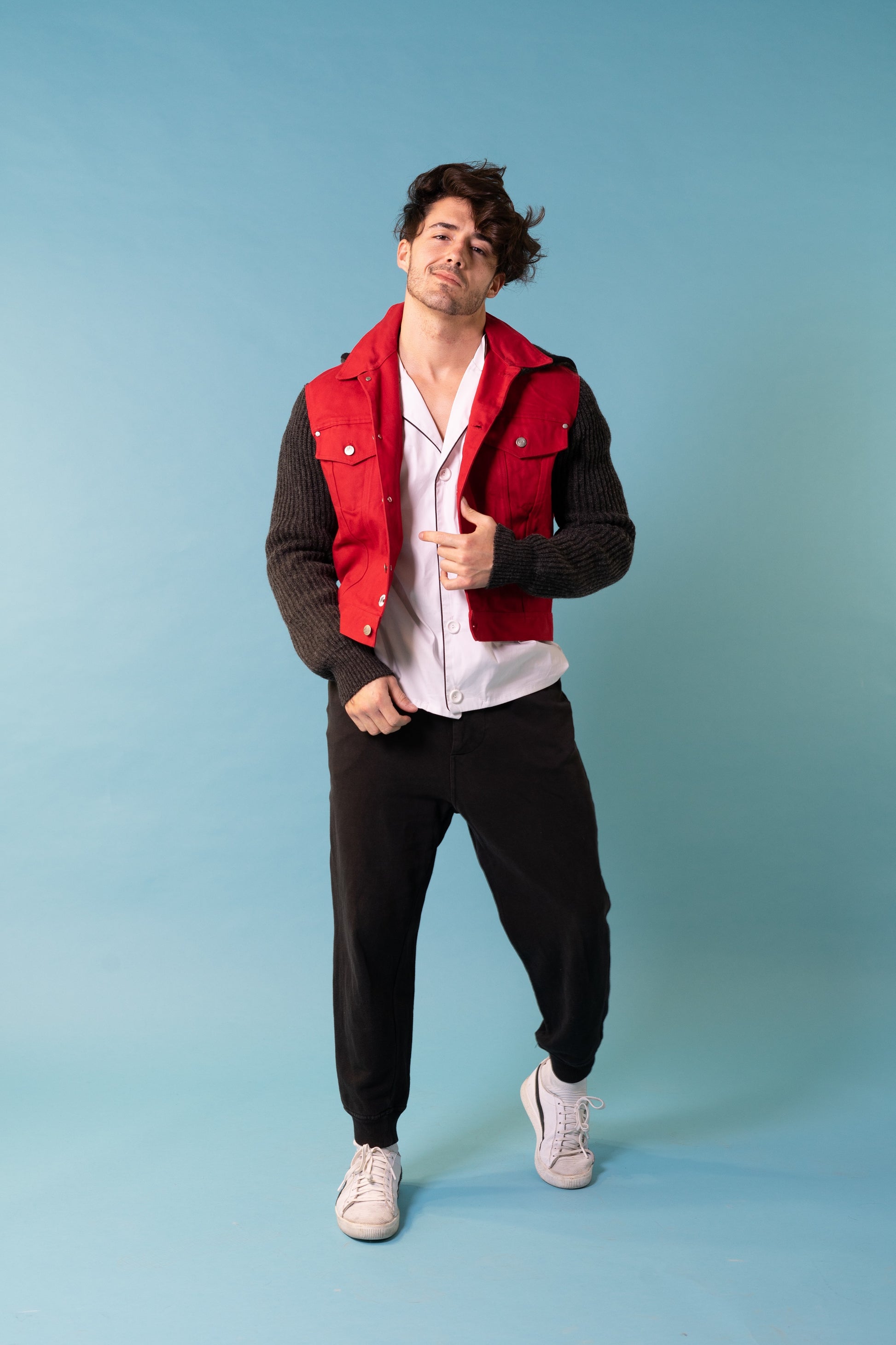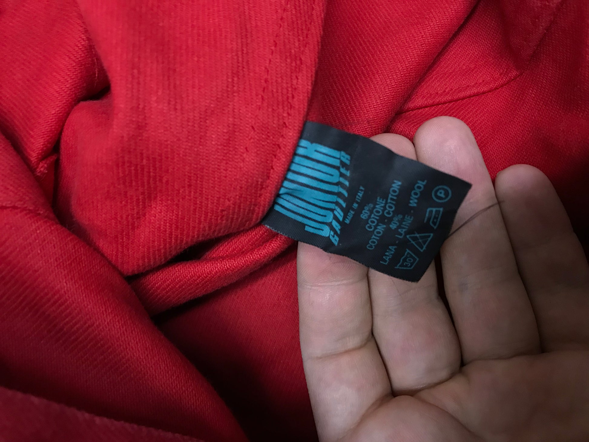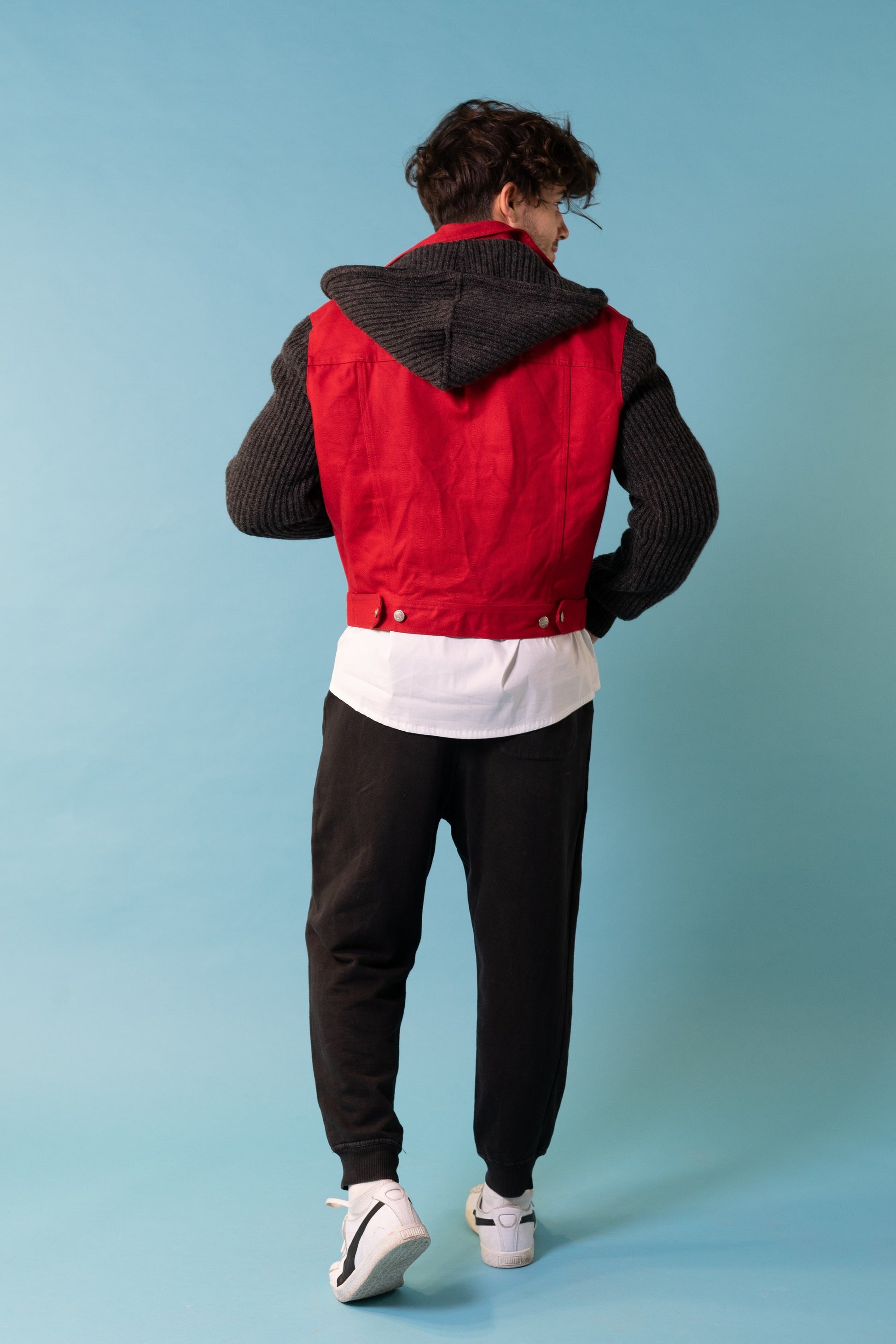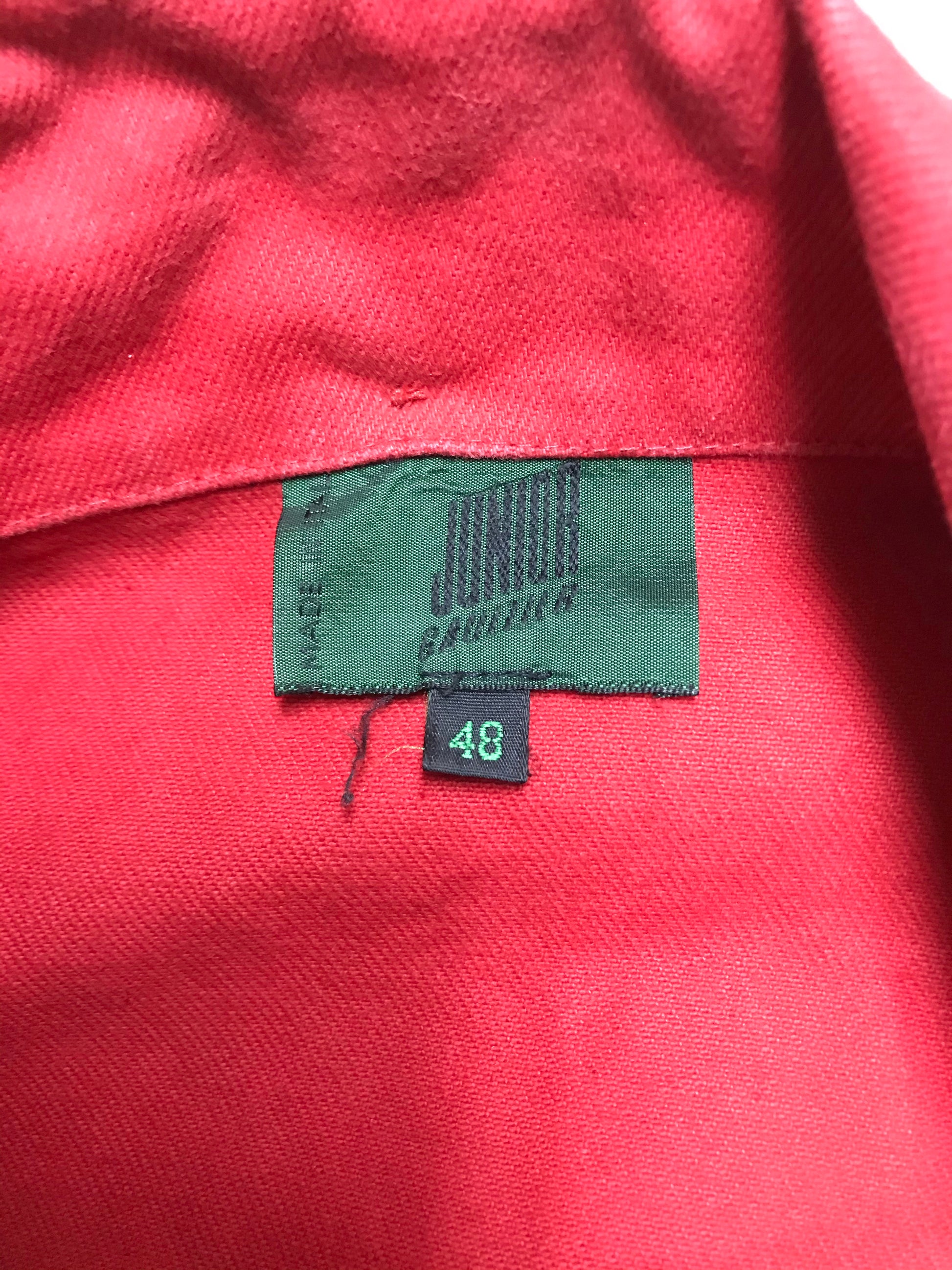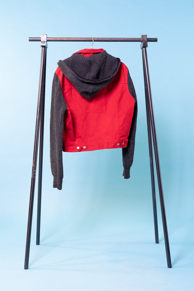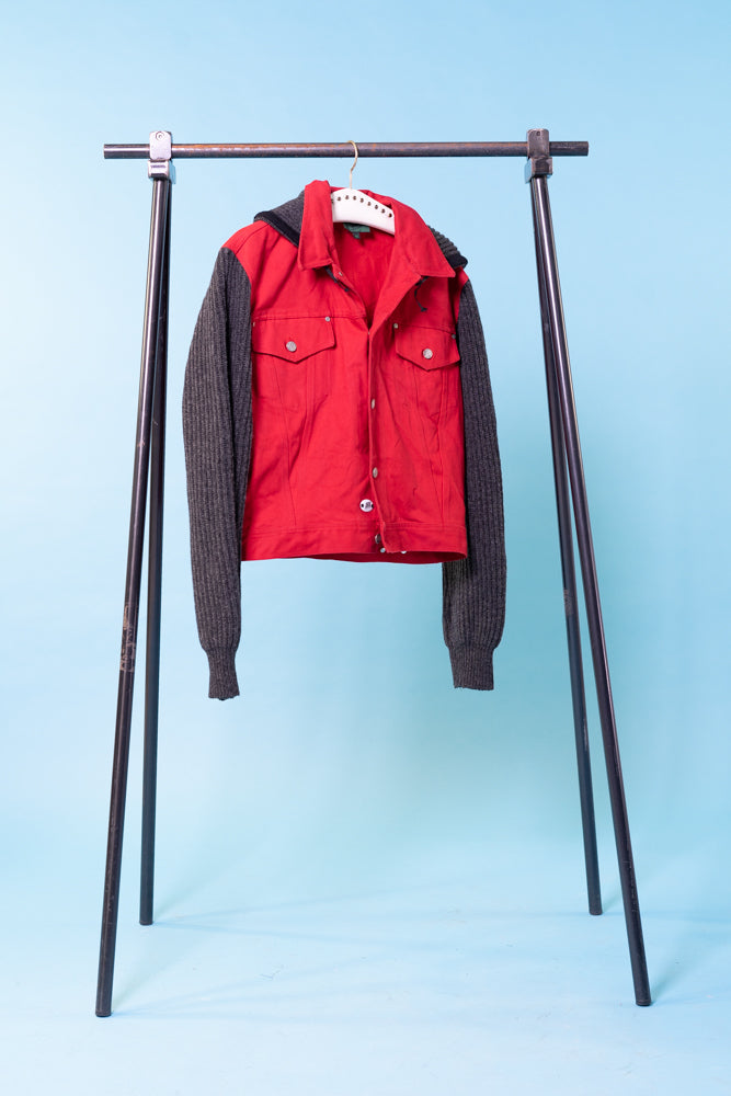 Vintage early 90s Jean Paul Gaultier Junior red denim jacket with knit wool sleeves and detachable hood. Really good condition.