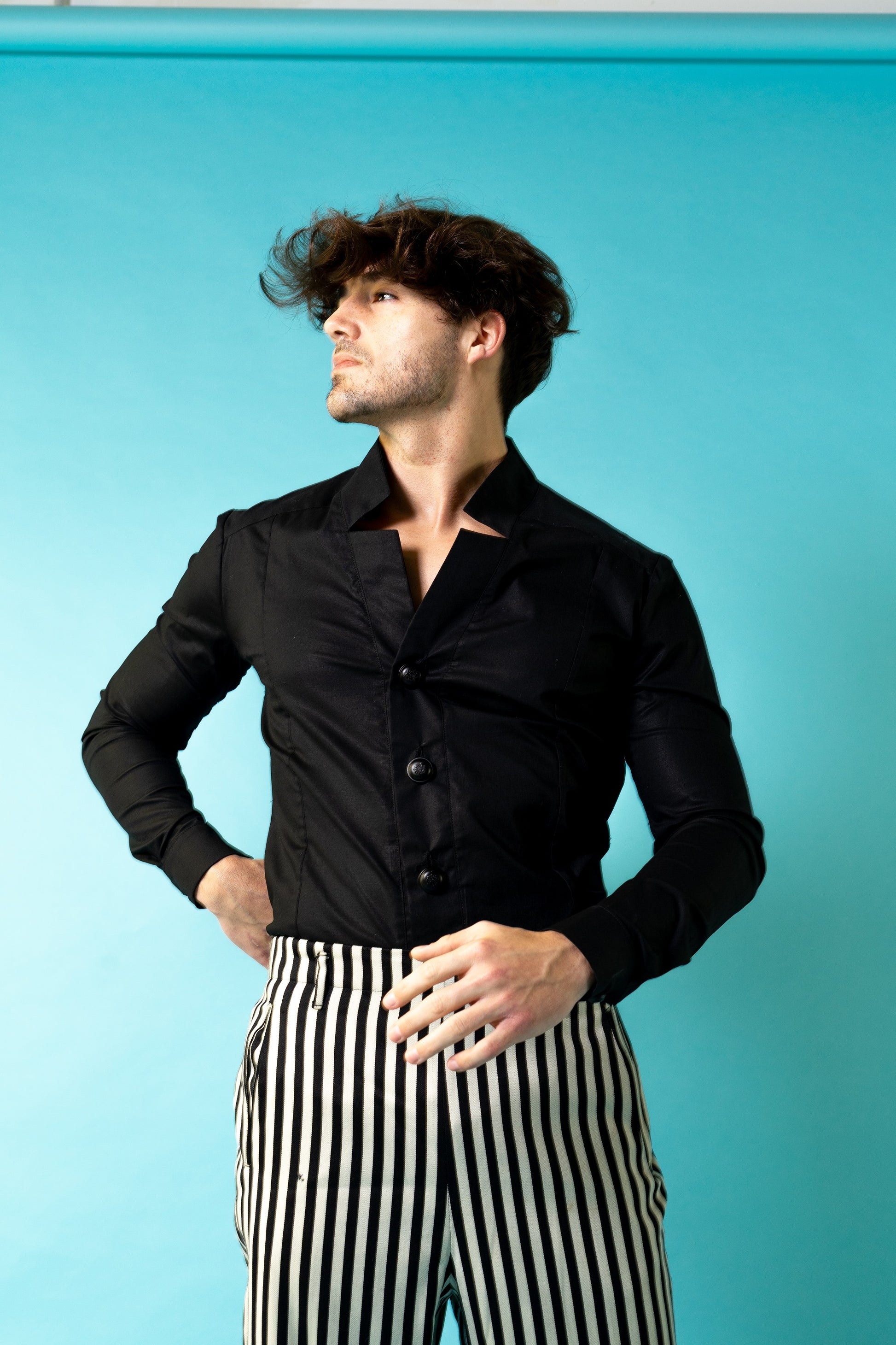Long sleeve shirt. Double breasted. Metal buttons.